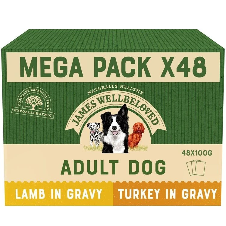 James Wellbeloved Grain Free Dog Food Pouch Turkey & Lamb in Gravy is wonderfully delicious and made with 100% natural meat. It is grain free and naturally hypoallergenic, meaning that it will be easier to digest and suitable for dogs who suffer from allergies.