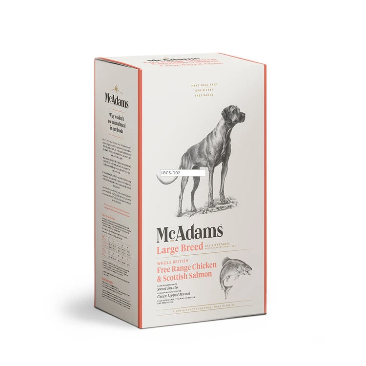 McAdams Free Range Chicken & Salmon Large Breed is a natural and grain free diet that is slow roasted and oven baked using the highest quality meat sources; Whole British Free-Range Chicken and sustainably sourced Scottish Salmon Fillets. This food has been designed for all life stages has increased levels of Green Lipped Mussel to help support and promote the health of large breed dogs’ joints.