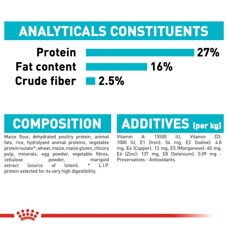 Ingredients: Maize flour, dehydrated poultry protein, animal fats, rice, hydrolysed animal proteins, vegetable protein isolate*, wheat, maize, maize gluten, chicory pulp, minerals, egg powder, vegetable fibres, cellulose powder, marigold extract (source of lutein). *L.I.P.: protein selected for its very high assimilation.